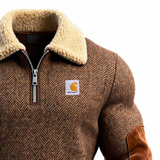 Men's Herringbone Wool Paneled Suede Quarter-Zip Fleece Lapel Sweatshirt
