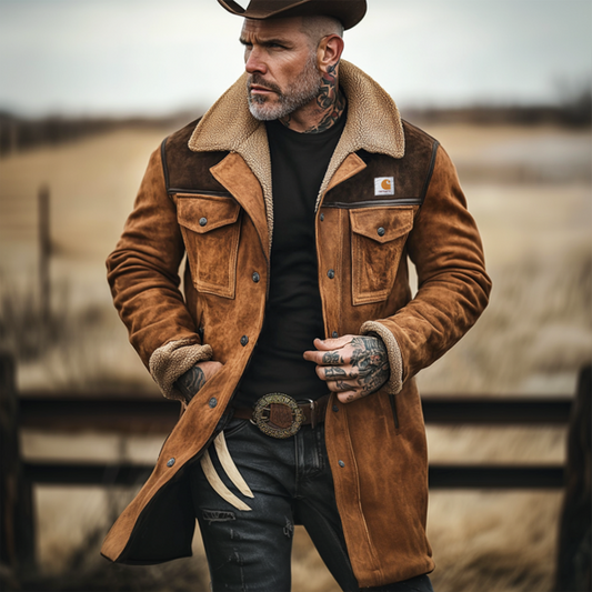 Men's Vintage Suede Patchwork Lamb Fleece Multi-Pocket Reverse Collar Outdoor Jacket Coat