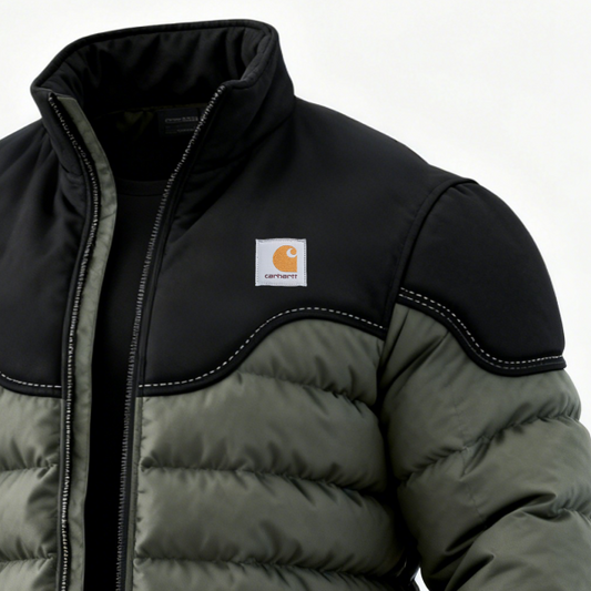 Men's Warm Olive Green Puffer Jacket with Black Accents