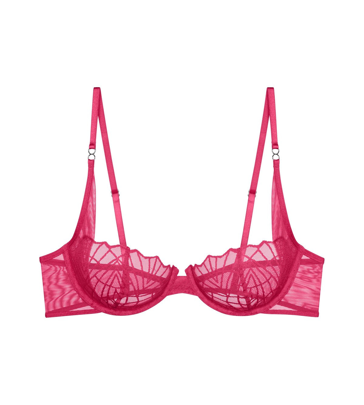 This wired bra delivers a sophisticated balconette silhouette that enhances your natural shape with confidence. The full lace cups and mesh side slings work together to create a flattering push-in effect that celebrates your curves. Graphic lace combined with transparent mesh panels brings an elevated sense of glamour to your everyday essentials.Low-coverage, wired, non-padded balconette braLight and flexible comfort wire for flexible wearPush-in effect with side slings for enhanced cleavageGraphic lace and mesh combined with signature ring detail for added styleMade with sustainably certified recycled fabric