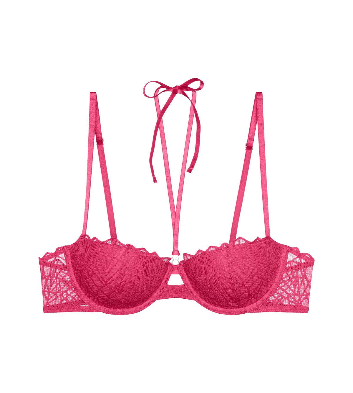 This balconette bra combines minimal coverage with maximum impact, designed to enhance your natural silhouette with sophisticated allure. The graphic lace design creates visual interest while the central keyhole details add distinctive character to this expertly crafted piece. Every element works together to deliver both style and confidence in one beautifully designed undergarment.Low-coverage wired and padded balconette braLight comfort wire for flexible wearSignature ring and keyhole detailsRemovable double strapsGraphic lace and mesh designMade with sustainably certified recycled fabric